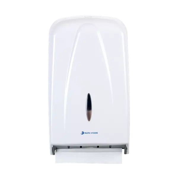 The Pacific Hygiene Hand Towel Dispenser Ultra 50 in white is a reliable and low-maintenance solution with a 300-tissue capacity. Manufactured from 100% recycled ABS plastic, it is a larger-sized versatile dispenser for high-traffic areas. Designed for Pacific slim paper towels, it offers a sight window for stock visibility and provides security with a key lock or easy access with a push button.